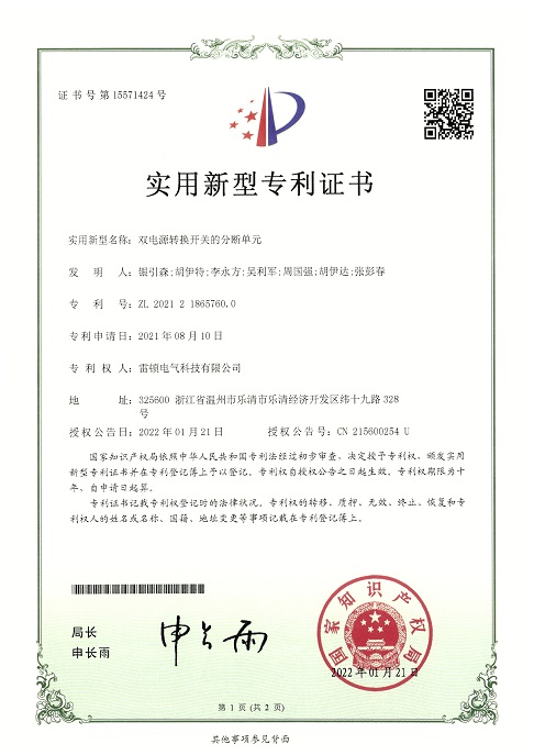 274[專(zhuān)利證書(shū)]雙電源轉(zhuǎn)換開(kāi)關(guān)的分?jǐn)鄦卧▽?shí)用)