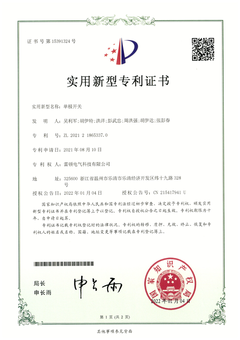 272[專(zhuān)利證書(shū)]單極開(kāi)關(guān)(實(shí)用)