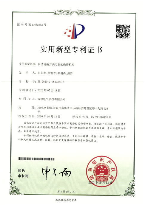 269[專(zhuān)利證書(shū)]自動(dòng)轉(zhuǎn)換開(kāi)關(guān)電器的操作機(jī)構(gòu)(實(shí)用)