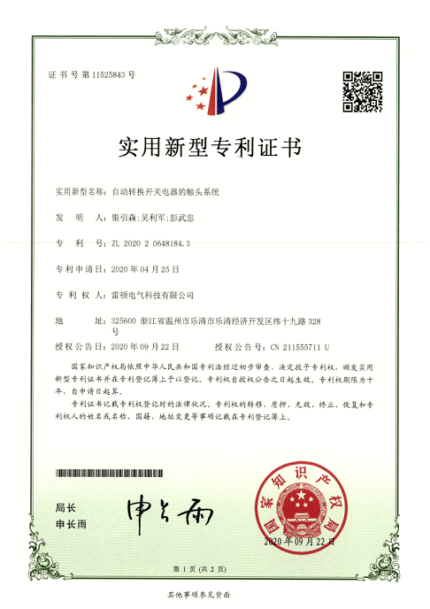 266[專(zhuān)利證書(shū)]自動(dòng)轉(zhuǎn)換開(kāi)關(guān)電器的觸頭系統(tǒng)(實(shí)用)