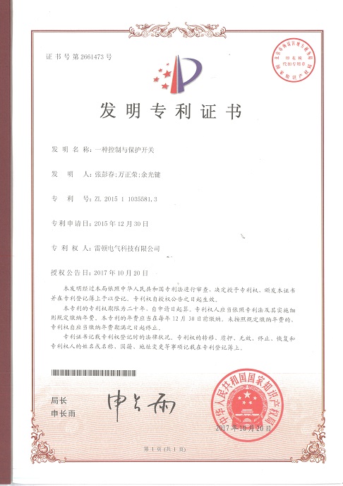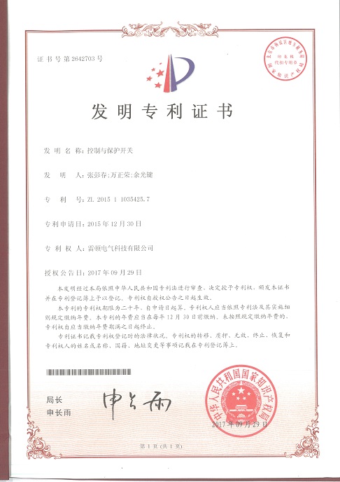 007[專利證書(shū)]一種控制與保護(hù)開(kāi)關(guān)(發(fā)明)