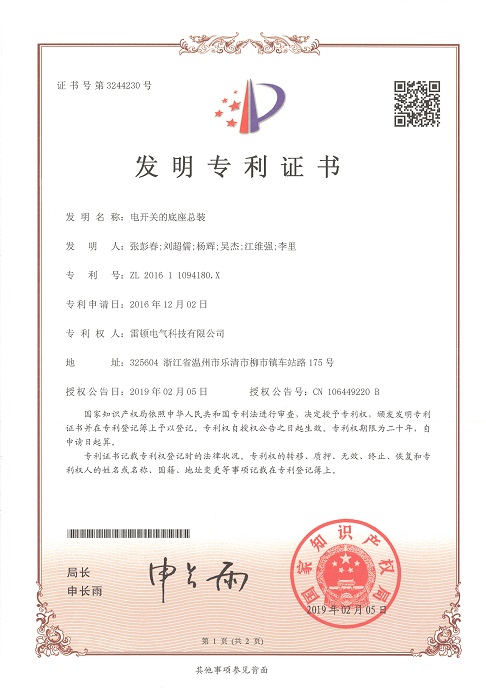 008[專利證書(shū)]電開(kāi)關(guān)的底座總裝(發(fā)明)