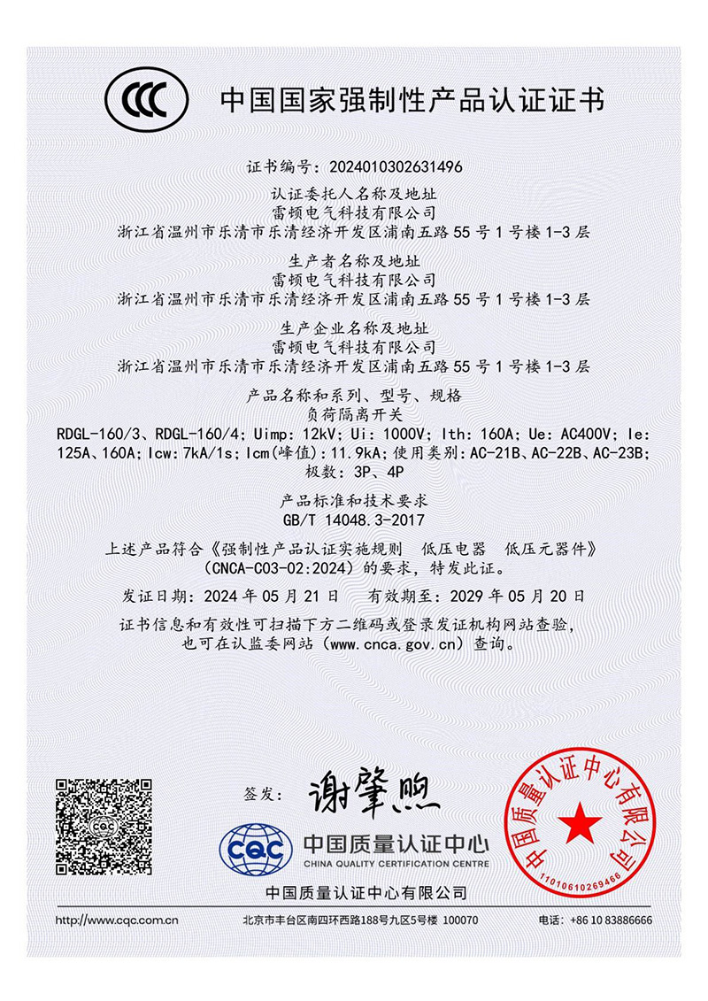 RDGL-160/3、RDGL-160/4 負(fù)荷隔離開關(guān)3C證書【CCC】