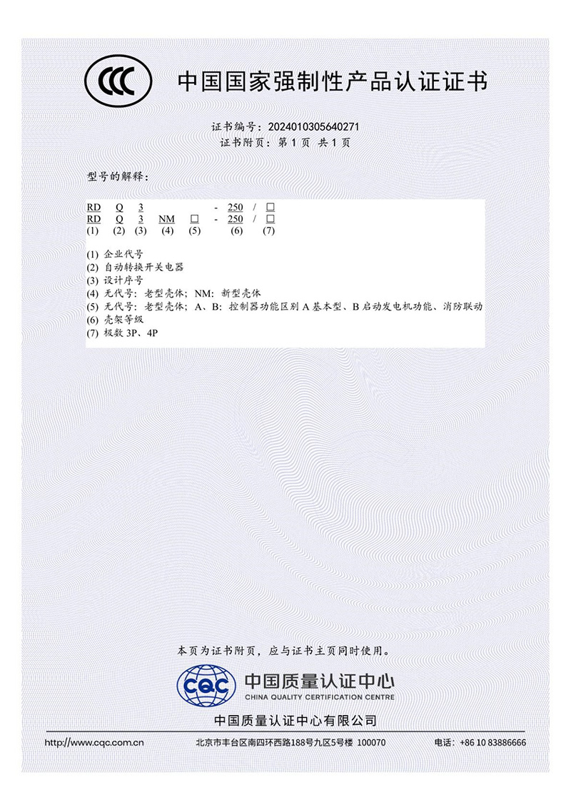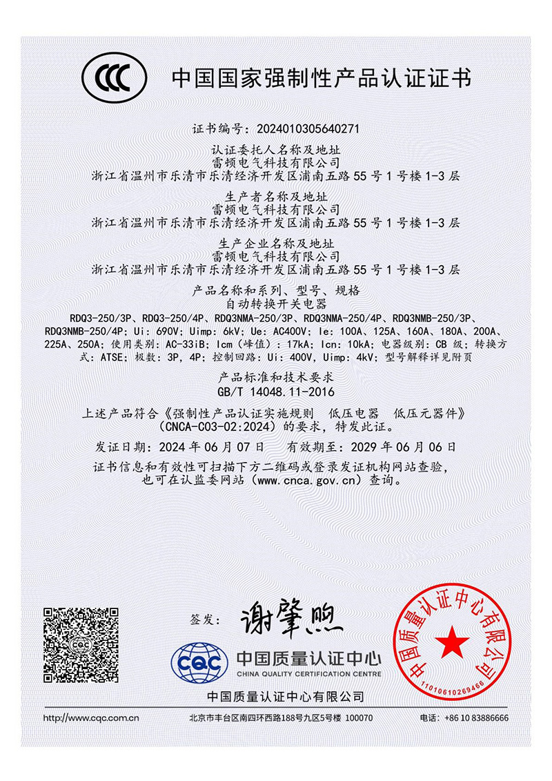 RDQ3-250/3P-4P、RDQ3NMA-250/3P-4P、RDQ3NMB-250/3P-4P自動(dòng)轉(zhuǎn)換開關(guān)電器3C證書-2【CCC】