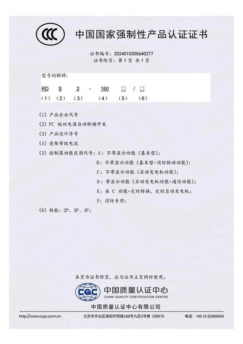 RDS2-160A、RDS2-160B、RDS2-160C、RDS2-160D、RDS2-160E、RDS2-160F自動(dòng)轉(zhuǎn)換開(kāi)關(guān)電器3C證書(shū)-2【CCC】