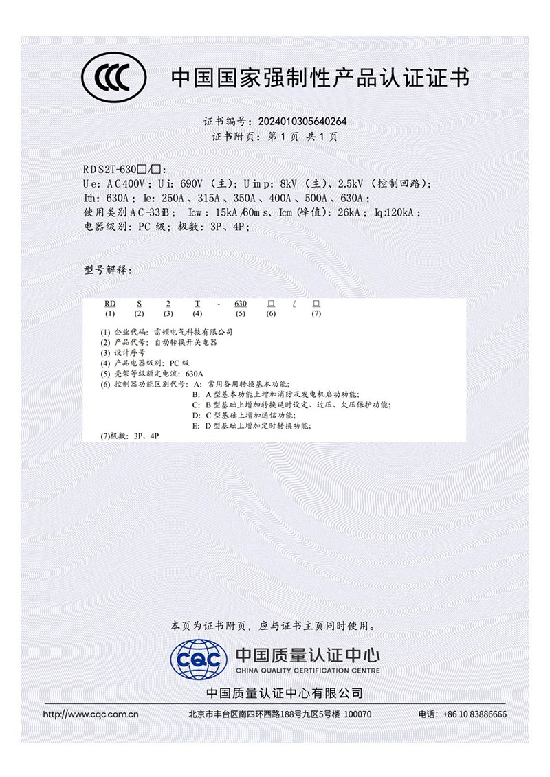 RDS2T-630□/□自動(dòng)轉(zhuǎn)換開關(guān)電器3C證書-2【CCC