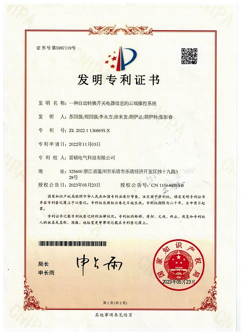 020[專利證書(shū)]一種自動(dòng)轉(zhuǎn)換開(kāi)關(guān)電器信息的云端操控系統(tǒng)(發(fā)明)
