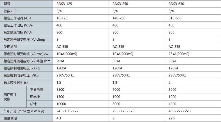 RDS3 系列產品屬于PC 級自動轉換開關電器,主要用于交流50/60Hz,額定電壓400V 及以下,額定工作電流至630A 的兩路中性點接地電源系統(tǒng)中,因一路電源發(fā)生異常而進行電源之間的切換,保證其供電的可靠性和安全性。