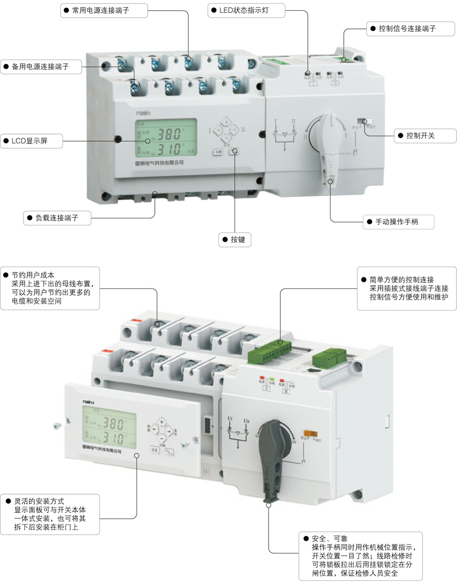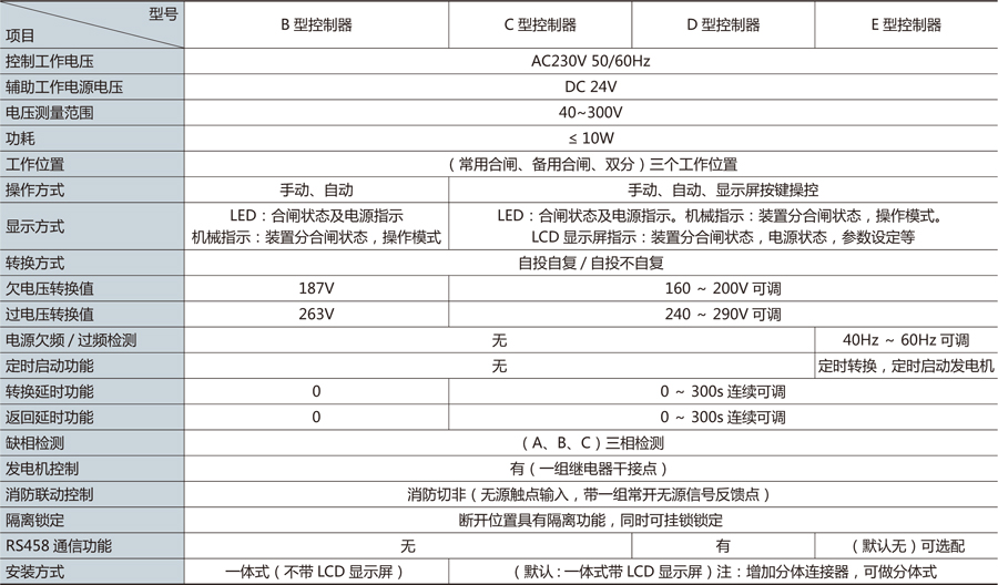 控制器具有欠壓、過壓、斷相自動切換功能和電動強制切換功能,自動模式集成自投自復和自投不自復兩種模式,適應不同使用場合;具有消防聯動功能,滿足緊急情況下斷開負載側電源的要求。