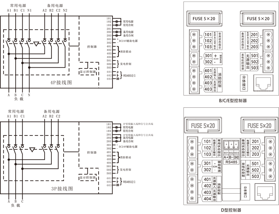 401、402- 消防聯動信號輸入端,該接口外部只能接一組常開無源觸點(若消防信號為有源信號時,必須通過一個小型繼電器轉接后再將繼電器常開觸點接入控制器)當外部觸點閉合后控制器立即控制開關轉換到分閘位置切斷負載電源。