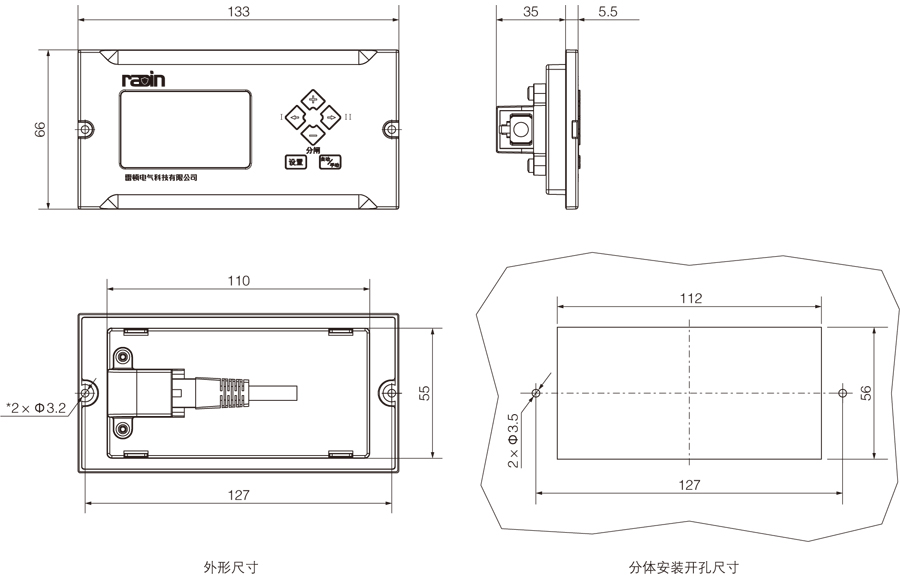 ● 顯示控制器外形及分體安裝開孔尺寸