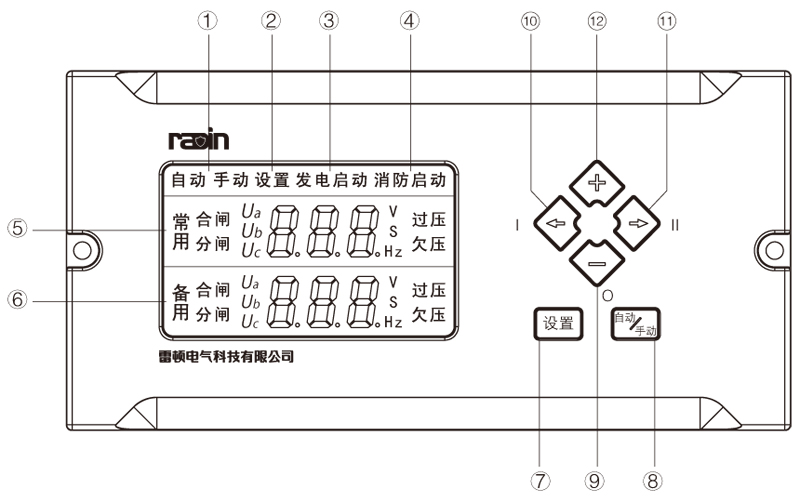 8:自動/ 手動轉換方式選擇按鈕:在正常使用時用作自動、手動轉換方式選擇,在設置狀態(tài)下為保存并退出功能;