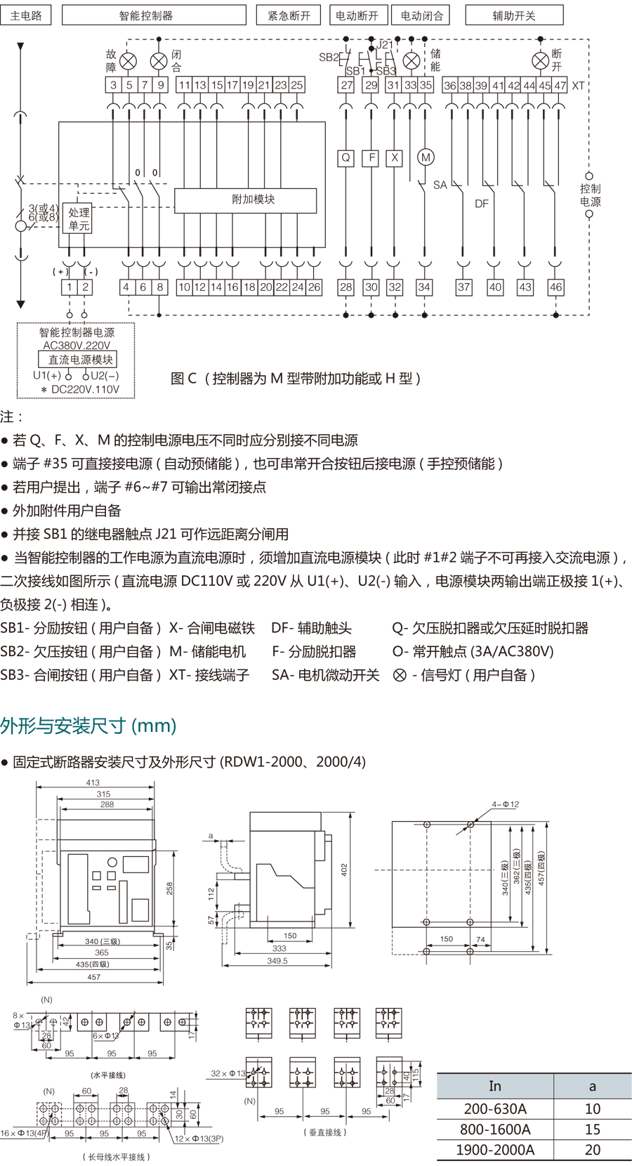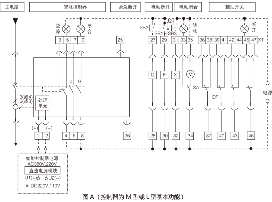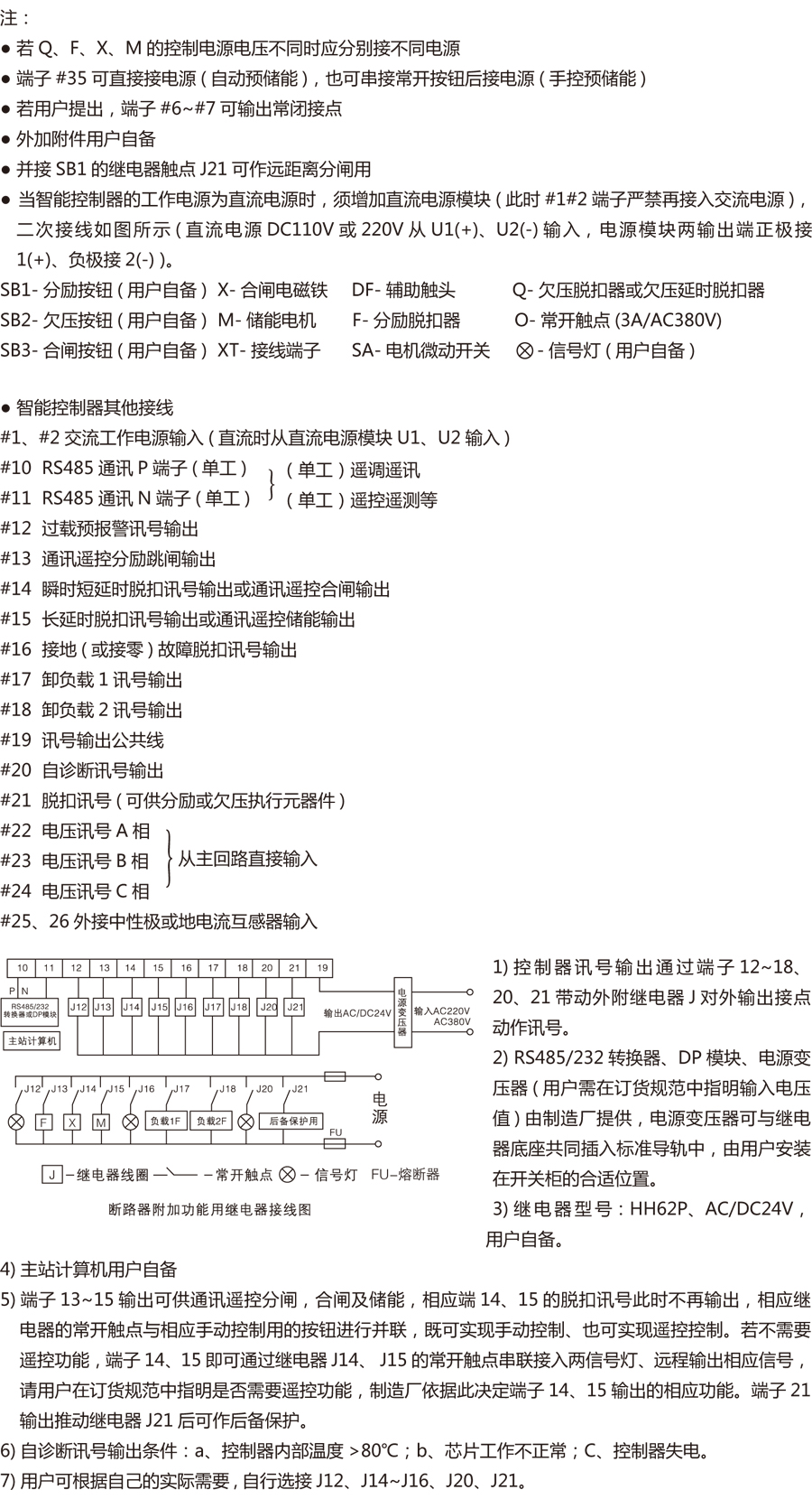 斷路器總體接線端子共有47 個(gè),接線簡(jiǎn)單、便于用戶使用,接線圖見(jiàn)圖A、圖B、圖C智能控制器其它接線