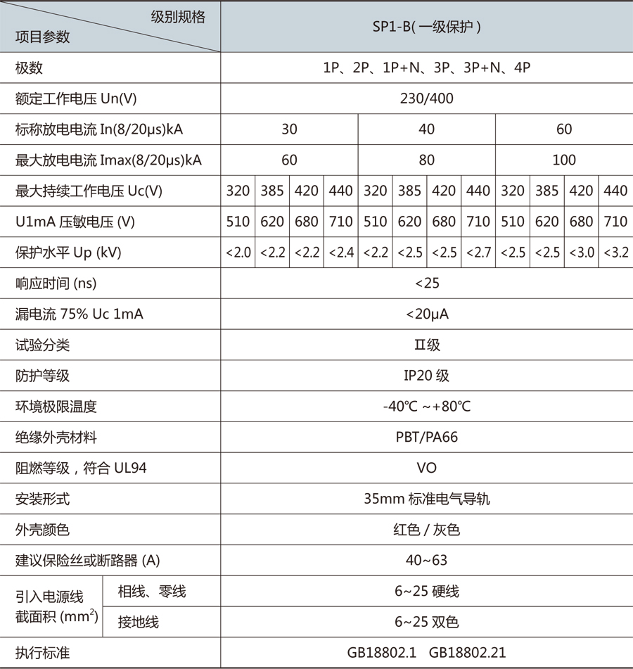 SP1-B系列電涌保護(hù)器適用于交流50/60Hz、230/400V及以下的TT、IT、TN-S、TN-C、TN-C-S等供電系統(tǒng)。其設(shè)計(jì)依據(jù)符合IEC61643-1、GB18802.1、GB50057的規(guī)定要求,可釋放100kA雷擊過(guò)電流,通常安裝在建筑物進(jìn)線的低壓主配電柜中。
