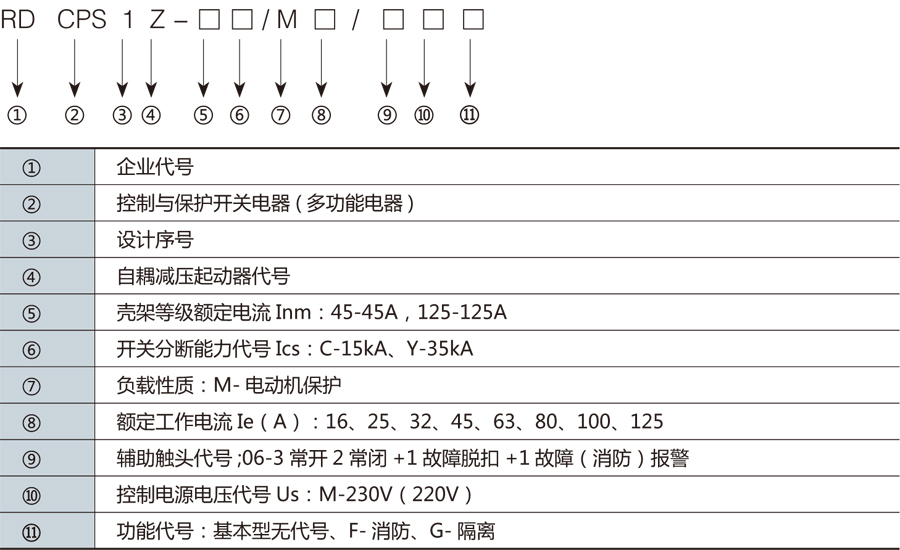 RDCPS1Z 型起動(dòng)器主要是由RDCPS1 系列控制與保護(hù)開(kāi)關(guān)電器(CPS)和其它電器原件組成,集中固定在一塊安裝板上,布置裝湊,布線合理,連續(xù)使用方便。